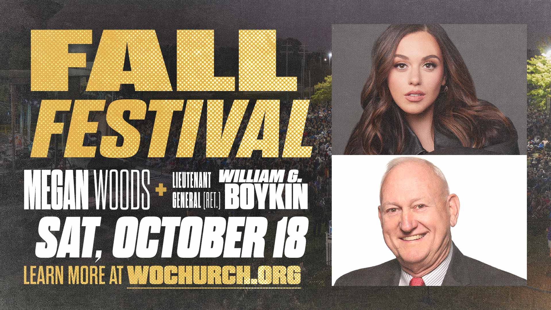 • Saturday, October 18, 6:00pm – Featuring Guest Speaker Lieutenant General (Ret.) William G. ā€œJerryā€ Boykin and Megan Woods leading worship during service and a post-service content. Both guests will return on Sunday morning, October 19, at 9:30am to speak and lead worship.
